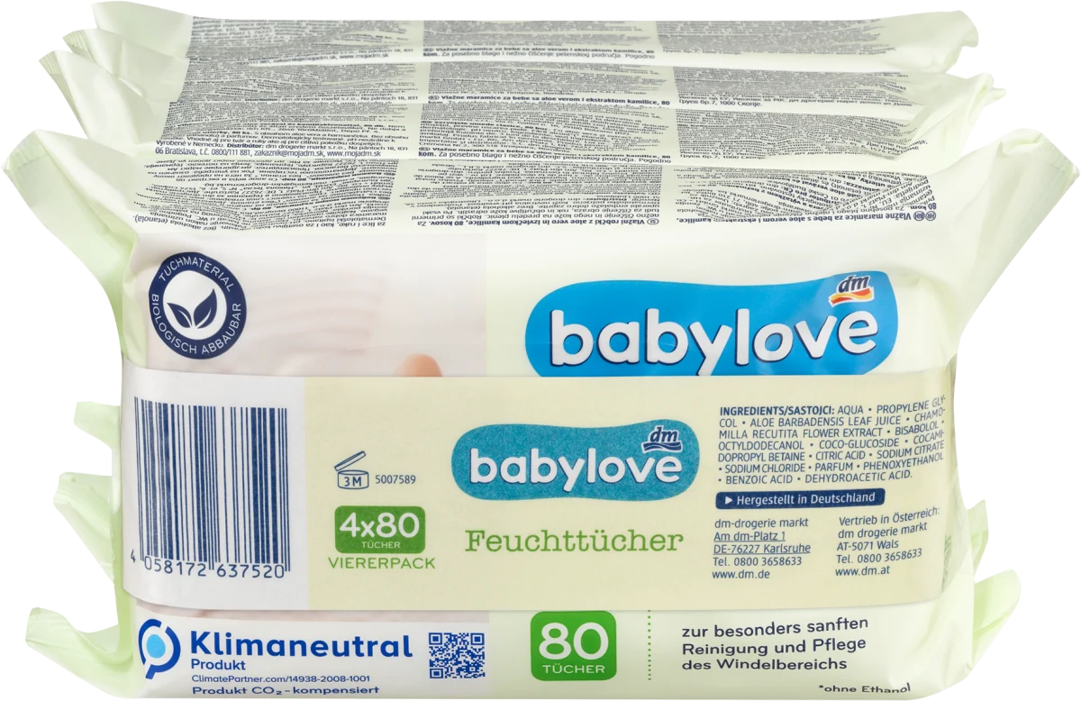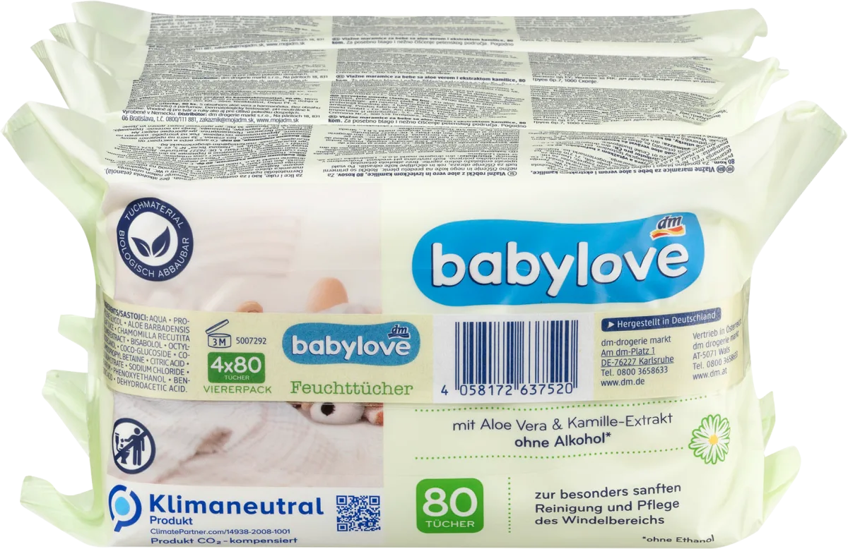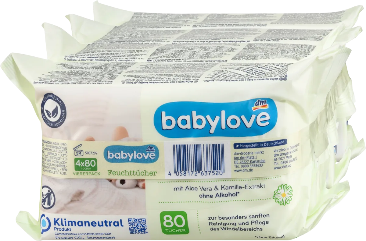 Chusteczki nawilżane babylove są wyjątkowo odporne na rozdarcia i szczególnie miękkie dla wrażliwej pupy dziecka. Łagodny balsam z wyciągiem z aloesu i rumianku nawilża i chroni skórę dziecka przed wysuszeniem. Chusteczki nawilżane nadają się również do oczyszczania twarzy i rąk, jak również do oczyszczania wrażliwej skóry dorosłych.