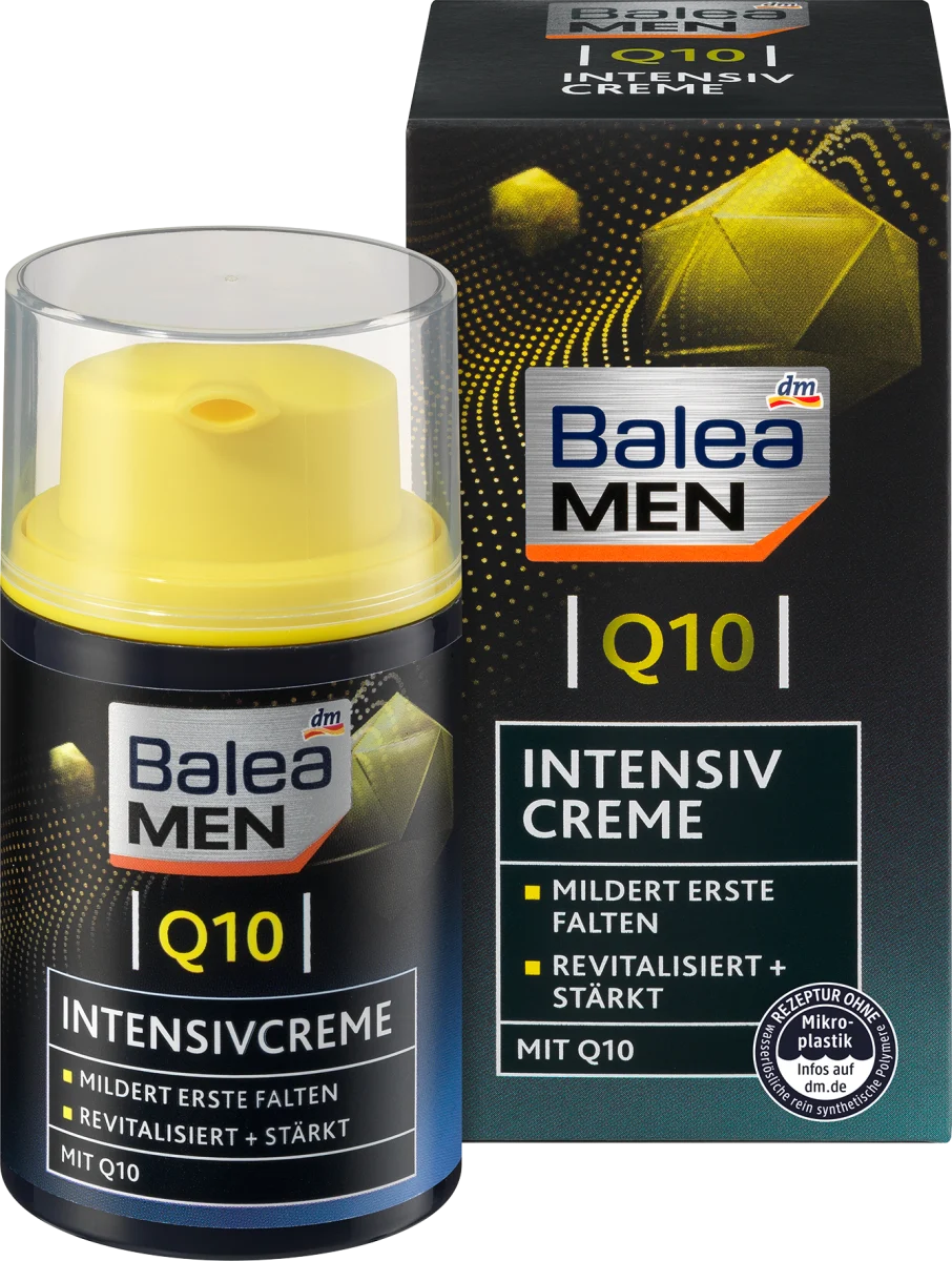 Balea Krem na dzień i na noc Q10 o intensywnym działaniu zmniejsza zmarszczki, stymuluje regenerację skóry i wspiera wewnętrzne procesy odbudowy. Zwiększa stopień nawilżenia skóry, a system ochrony UV zabezpiecza ją przed przedwczesnym fotostarzeniem – dla wzmocnionej i intensywnie odżywionej skóry i świeżego wyglądu. Receptura bez mikroplastiku i rozpuszczalnych w wodzie czysto syntetycznych polimerów.