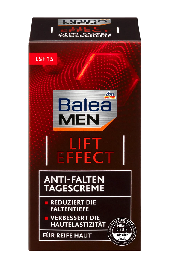 Przeciwzmarszczkowy krem na dzień Balea MEN lift effect ze specjalnym kompleksem aktywnym sprawia, że skóra mężczyzny staje się jędrna i napięta – każdego dnia. Głębokość zmarszczek zostaje zredukowana, a twarz wygląda na wygładzoną. Wysoce skuteczna formuła z kompleksem Vital Active poprawia elastyczność skóry. Dodatkowo filtr SPF 15 zapewnia ochronę przed promieniowaniem UVA i UVB, zapobiegając przedwczesnemu starzeniu się skóry spowodowanemu działaniem słońca. A Ty zyskujesz nową odporność i jędrność skóry, potężny blask i redukcję zmarszczek. Receptura bez mikroplastiku i rozpuszczalnych w wodzie czysto syntetycznych polimerów.