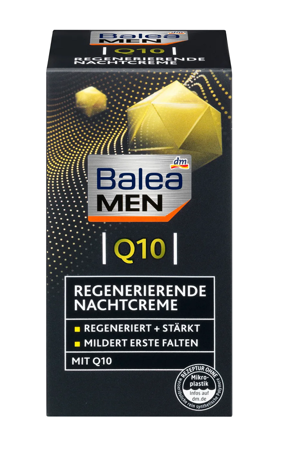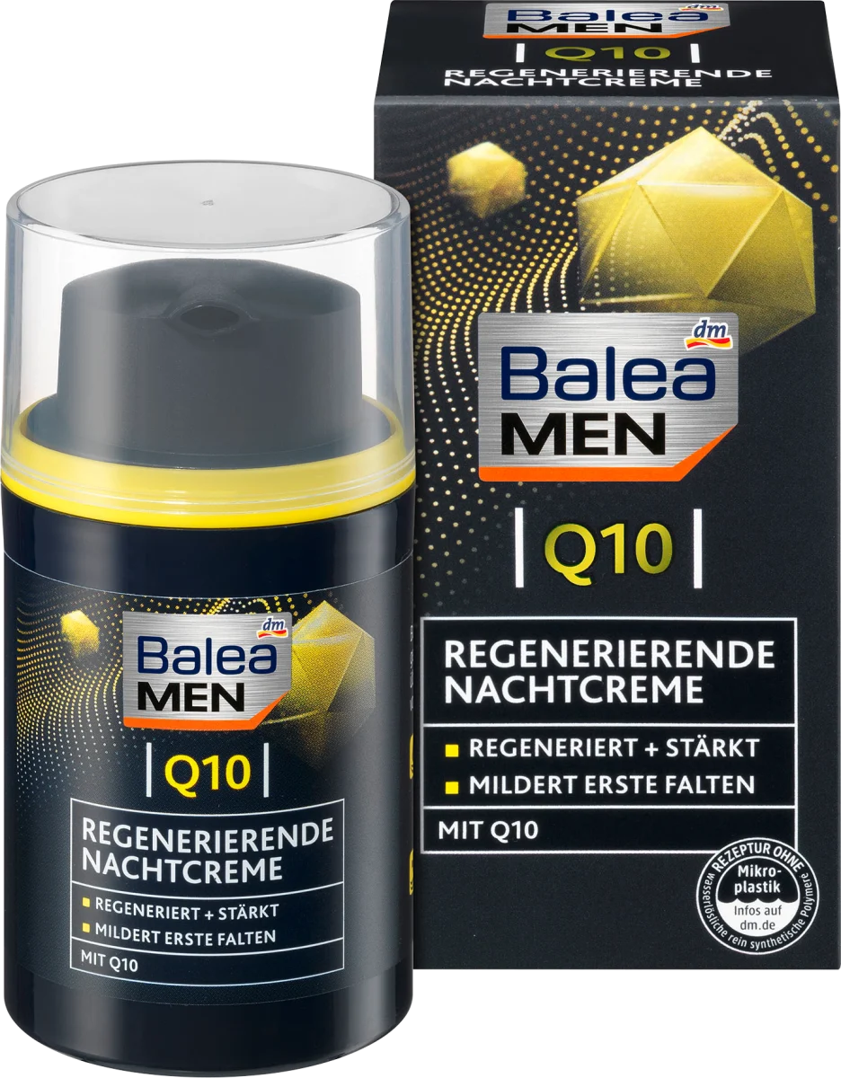 Dzięki cennym składnikom, takim jak koenzym Q10, masło shea i pantenol, krem na noc Balea MEN Q10 regeneruje i pielęgnuje męską skórę. Nawilża męską skórę i spłyca zmarszczki, tym samym zapewniając regenerację i wzmocnienie. Formuła bez mikroplastiku i rozpuszczalnych w wodzie czysto syntetycznych polimerów.