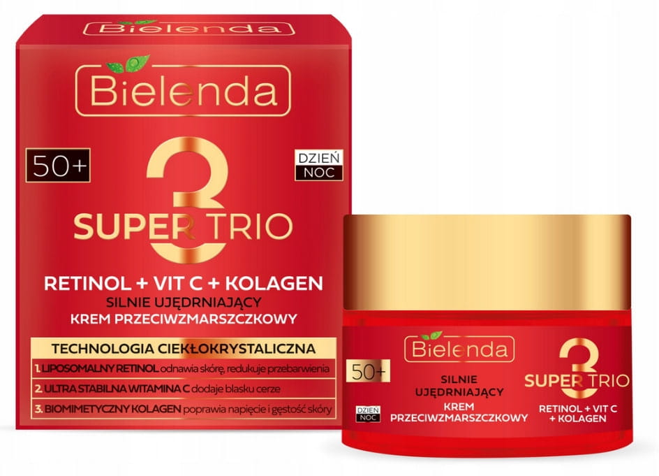 Połączenie trzech mega skutecznych składników o udowodnionym działaniu: RETINOLU, WITAMINY C oraz KOLAGENU, zatopionych w zaawansowanych technologicznie ciekłokrystalicznych formułach, tworzy SUPER TRIO, które jest w stanie maksymalnie zredukować widoczne na skórze oznaki upływającego czasu.
