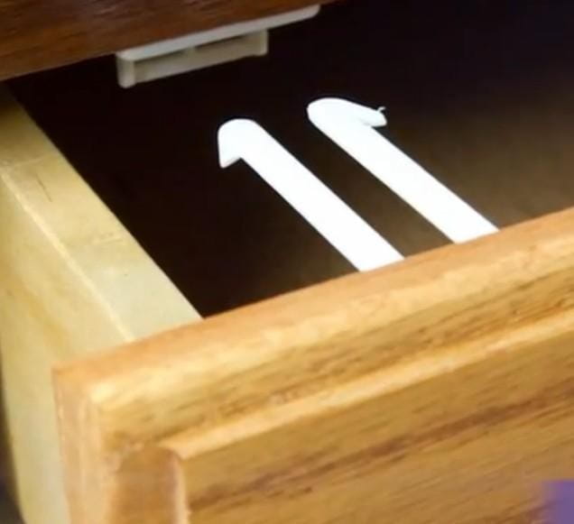 Blokady z podwójnymi kołkami zapewniają łatwy dostęp dorosłym, jednocześnie uniemożliwiając otwieranie szuflad i szafek dzieciom. Do zastosowania na górne bądź boczne krawędzie większości szafek. Blokadę można stosować na najwyżej zamontowanych szufladach, bądź na znajdujących się niżej jeżeli posiadają górną przegrodę do której może być zamontowany zamek/ zapadka.