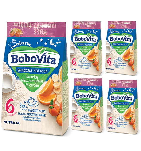 BoboVita Kaszka Smaczna kolacja mleczno-ryżowa 3 owoce 5x330g 6+