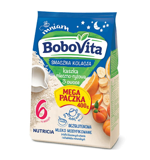 Nasze kaszki BoboVita odpowiadają na szczególne potrzeby żywieniowe Twojego dziecka. Z nimi każda chwila ma pyszny smak, a Ty możesz się cieszyć radosnym „Mniam”! Kaszka smaczna kolacja mleczno-ryżowa 3 owoce została starannie skomponowana tak, by zawierała to, co dobre dla Twojego dziecka przed snem.