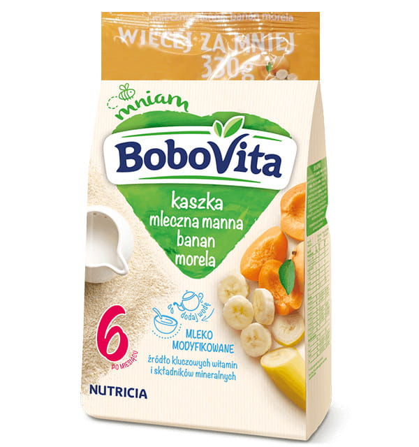Nasze kaszki BoboVita odpowiadają na szczególne potrzeby żywieniowe Twojego dziecka. Z nimi każda chwila ma pyszny smak, a Ty możesz się cieszyć radosnym „Mniam”! Kaszka mleczna manna banan morela, została starannie skomponowana tak, by zawierała to, co dobre dla Twojego dziecka.
