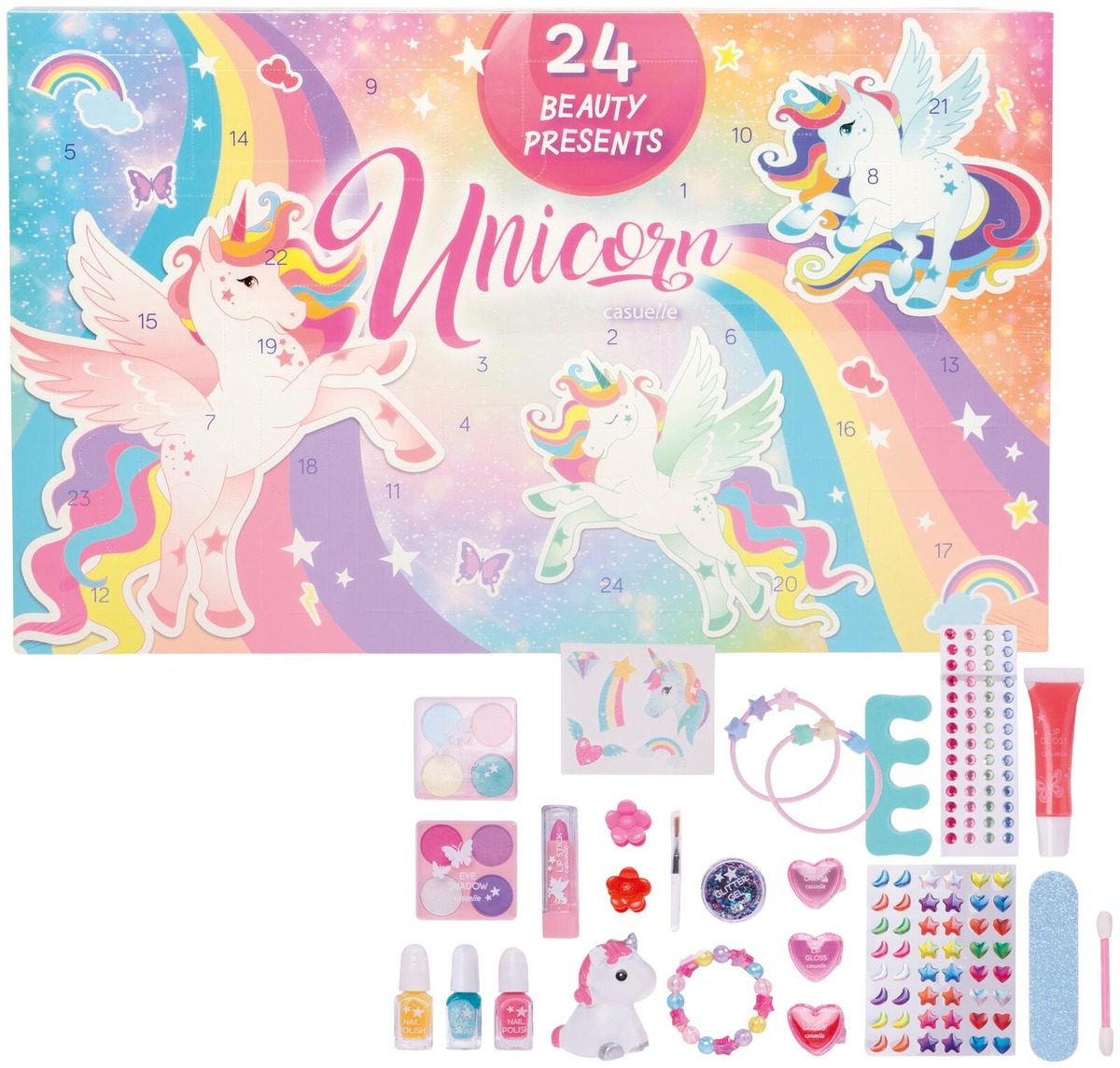Casuelle Unicorn Meikkijoulukalenteri to wyjątkowy kalendarz adwentowy z kosmetykami, który umili odliczanie dni do świąt każdej miłośniczce jednorożców i kolorowego makijażu. Za 24 okienkami kryją się urocze niespodzianki kosmetyczne, pozwalające każdego dnia odkrywać nowy element beauty-stylizacji.