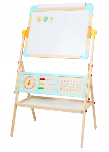 Na środkowej części tablicy znajdują się edukacyjne elementy, które wspierają naukę. Dziecko może ćwiczyć odczytywanie godziny na zegarze, uczyć się liczenia na liczydle oraz poznawać litery na tabliczce z alfabetem. To sprawia, że sztaluga jest nie tylko miejscem do zabawy, ale i praktycznym narzędziem edukacyjnym.
