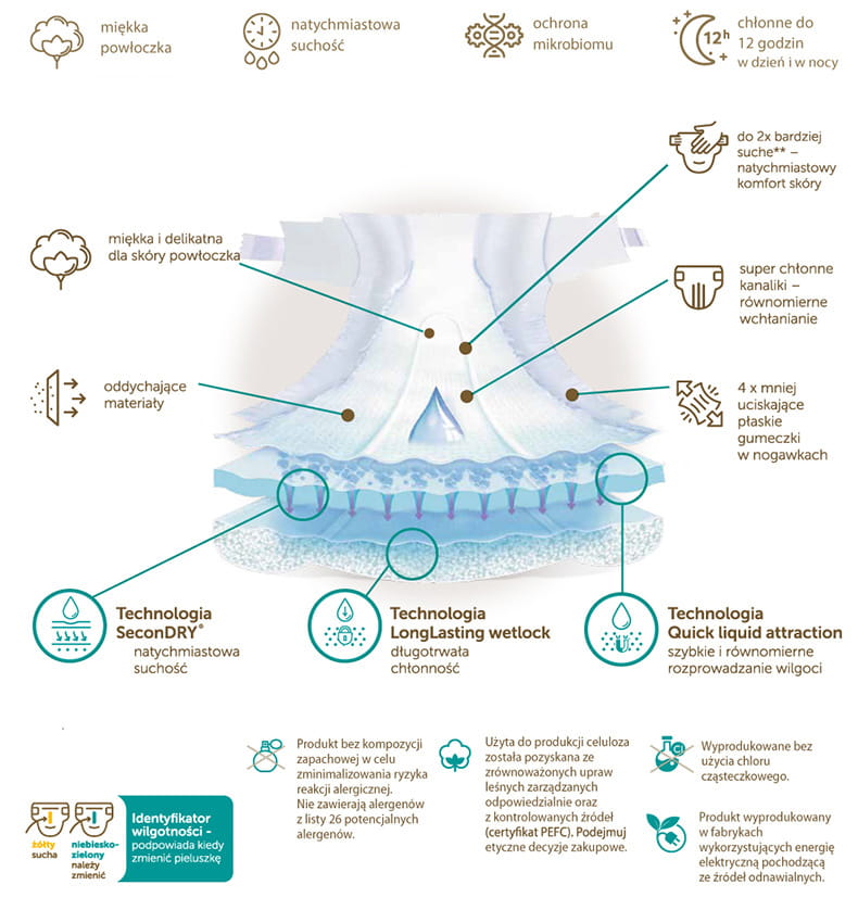 Zastosowanie nowych technologii Double Lock Layer oraz Wee Zones zapewnia efektywne odprowadzenie wilgoci w każdej pozycji zarówno dla dziewczynek, jak i chłopców. Konstrukcja pieluszki sprawia, że wilgoć jest natychmiast transportowana i długotrwale wiązana we wkładzie chłonnym pieluszki. Dzięki temu pieluszka staje się natychmiast sucha, utrzymując skórę dziecka w komforcie.