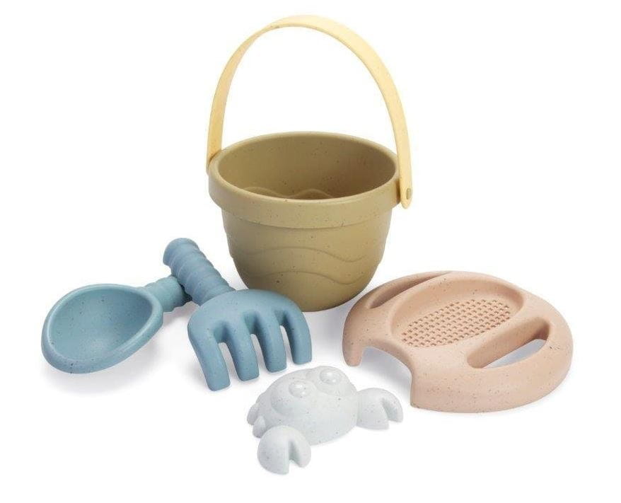 Ten śliczny zestaw do piasku w stonowanych, naturalnych kolorach jest idealny do zabawy na zewnątrz.