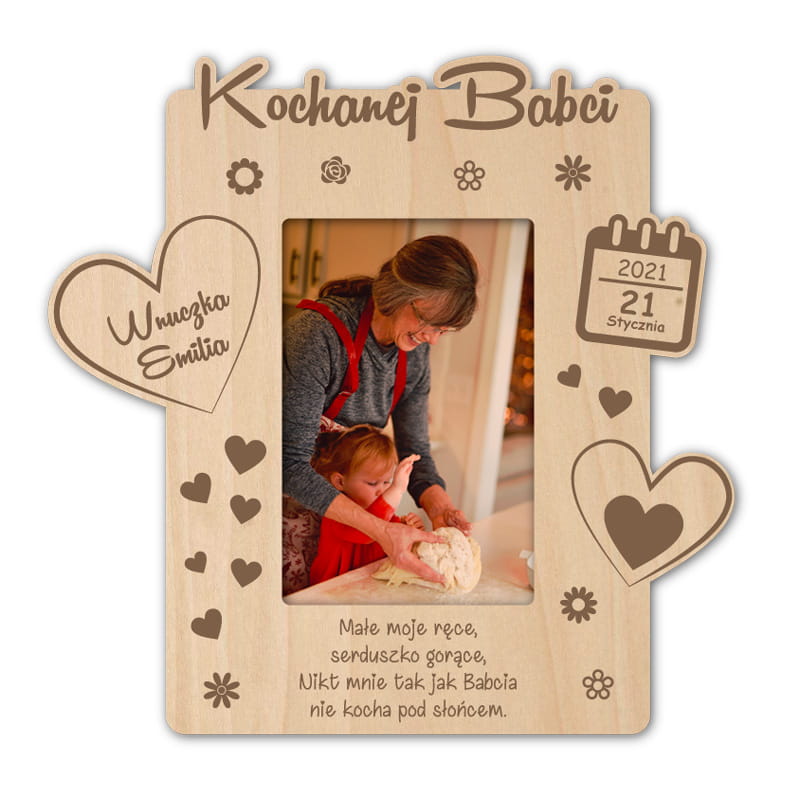 Wygrawerujemy dla Ciebie dowolnie wybraną sentencję lub cytat. Możesz na niej zawrzeć takie informacje jak swoje imię lub imię babci, wybraną datę (dzień babci lub swoje urodziny) i wiele innych.