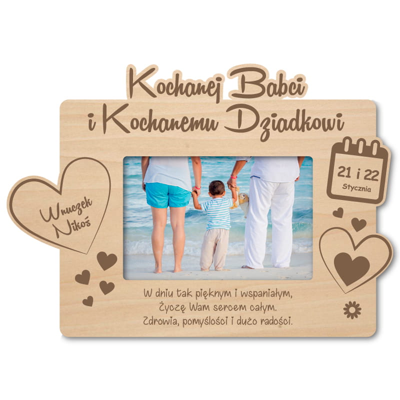 Wygrawerujemy dla Ciebie dowolnie wybraną sentencję lub cytat. Możesz na niej zawrzeć takie informacje jak swoje imię lub imiona babci i dziadka, wybraną datę (dzień babci, dziadka lub swoje urodziny) i wiele innych.