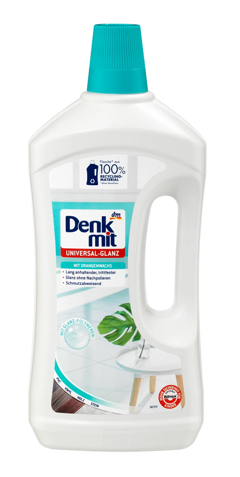 Nabłyszczający płyn do podłóg marki Denkmit zapewnia długotrwały połysk bez konieczności dodatkowego polerowania oraz sprawia, że podłoga jest odporna na ślady po butach i brud. Formuła produktu z woskiem pomarańczowym gwarantuje delikatne czyszczenie i skuteczne czyszczenie podłóg.