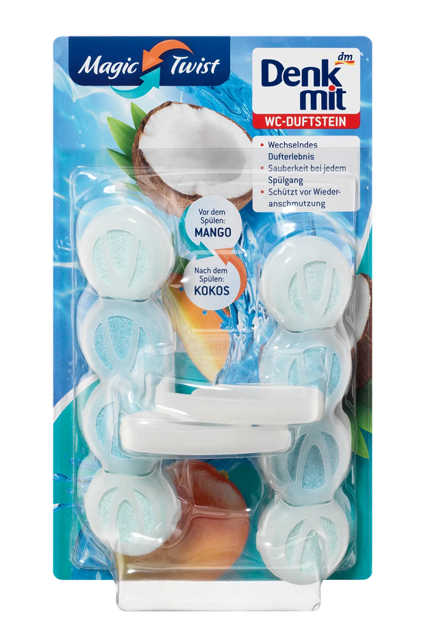 Przedstawiamy Ci Denkmit Zawieszkę do WC Magic Twist o zapachu mango-kokos, która zapewnia skuteczne czyszczenie i odświeżenie Twojej toalety. Ta innowacyjna kostka do toalety zmienia zapach przy każdym spłukaniu - przed spłukaniem pachnie mango, a po spłukaniu uwalnia zapach świeżego kokosa.