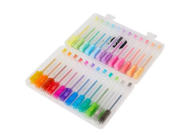 Małe długopisy żelowe w wesołych kolorach, które możesz zabrać ze sobą w poręcznym pojemniku. Notatki, listy czy spotkania zapisane w kalendarzu staną się prawdziwymi dziełami sztuki dzięki żelowym długopisom w jaskrawych, brokatowych, metalicznych i pastelowych kolorach tęczy.
