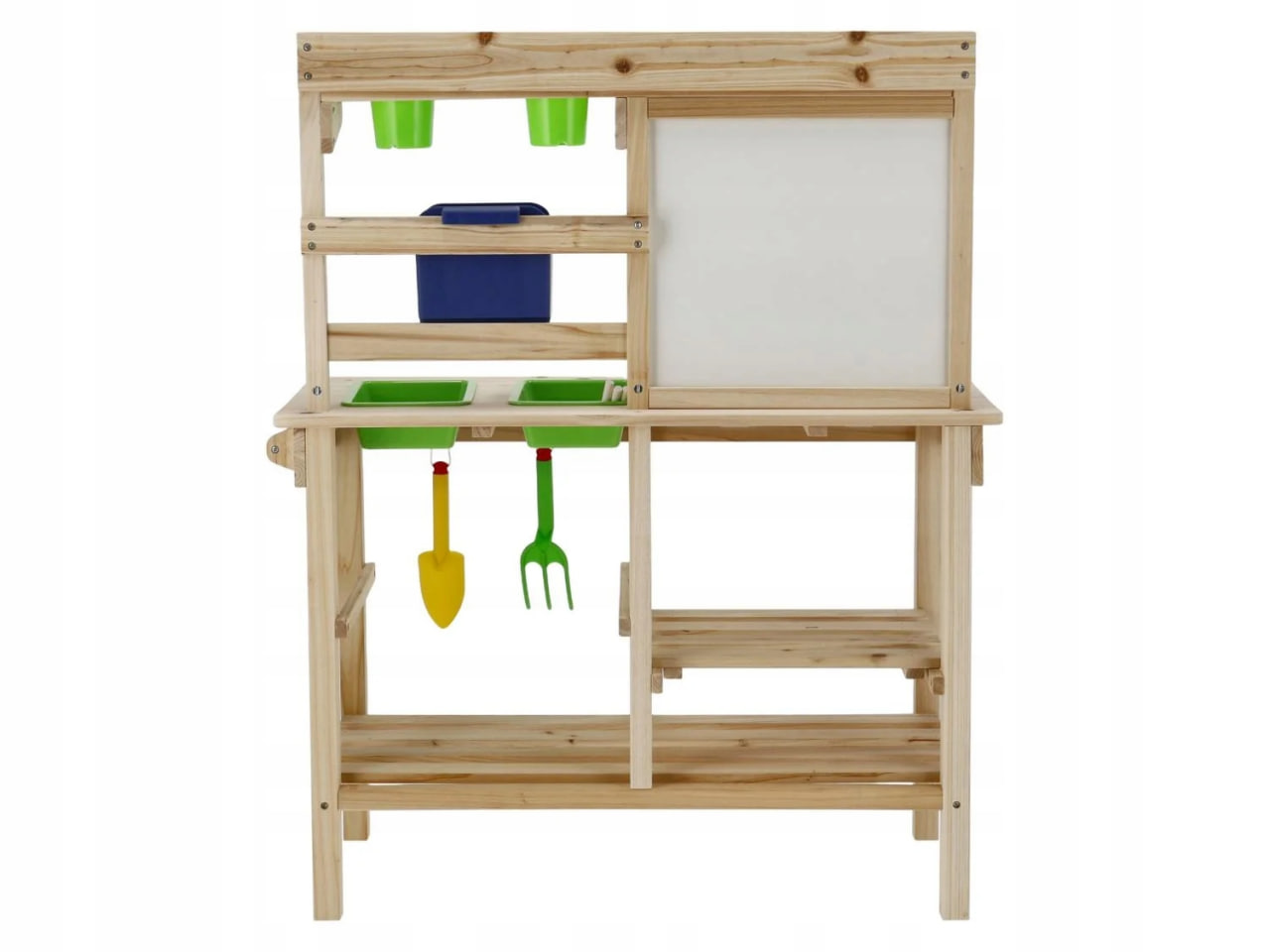 1x kuchnia błotna wraz z 2x doniczkami, 1x tablica do pisania, 3x kreda, 2x zlewozmywaki, wyjmowane, 2x płyty grzewcze, 2x regulatory do płyt grzewczych, obrotowe, 2x drewniane kołki do zawieszania akcesoriów, 1x wieszak na ręczniki (prawy), 1x półki pod blatem (wyjmowane), śruby ze stali nierdzewnej, 1x zbiornik na wodę z kranem (z prawdziwą funkcją kranu), przesuwny, 2x narzędzia ogrodowe z linką, łopatka, widelec
