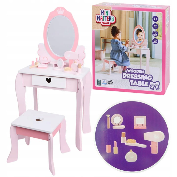 Ta drewniana toaletka Mini Matters to wspaniały sposób, aby Twoja córka mogła wyrazić swoją kreatywność, bawiąc się w makijaż i przygotowywanie się do różnych zabawek.