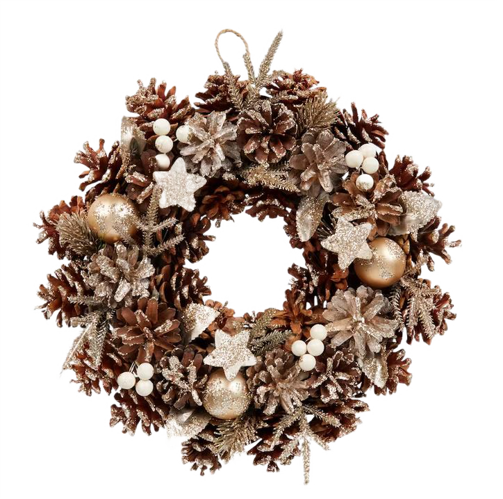 Ten piękny wieniec, wykonany z naturalnych materiałów, jest odpowiedni zarówno do użytku wewnątrz, jak i na zewnątrz pomieszczeń. Naturalne materiały ozdobione sztucznym śniegiem lub brokatem. Gdy dekoracja nie jest w użyciu, można ją łatwo schować do następnych Świąt Bożego Narodzenia, dzięki czemu stanowi ona ekonomiczny wybór. Święta nie są kompletne bez nastrojowego wieńca na drzwiach. Możesz po prostu wyjąć go z opakowania i zawiesić, by stworzyć miłą atmosferę.