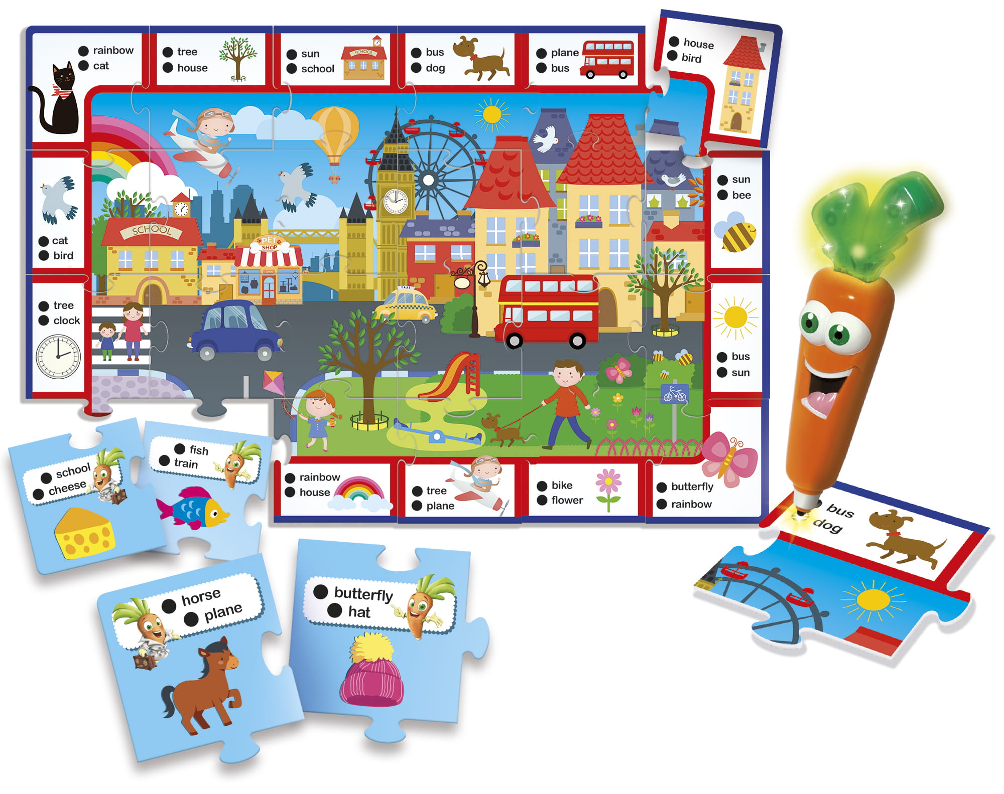 Zestaw do nauki języka angielskiego z serii Carotina Baby dedykowany jest maluchom, które rozpoczynają swoją przygodę z nauką języka obcego. Podczas zabawy dzieci będą poznawały podstawy języka angielskiego z użyciem radosnej marchewki, która motywuje maluchy do nauki radosnymi okrzykami za udzielenie prawidłowej odpowiedzi. Wystarczy dotknąć końcówką długopisu czarną kropkę przy odpowiedzi. Można bawić się również w szukanie elementów z ramki na środkowym obrazku. Zalety: pomaga w podstawowej nauce języka angielskiego, rozwija myślenie logiczne oraz zdolności manualne. Zawartość opakowania: 24-częściowe puzzle, mówiący i świecący długopis Carotina. Cechy: wymagane baterie: 2xAG13/LR44 1,5V(w zestawie), wymiary opakowania: 29,2x24,5x5,5cm, wiek: 3+.