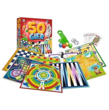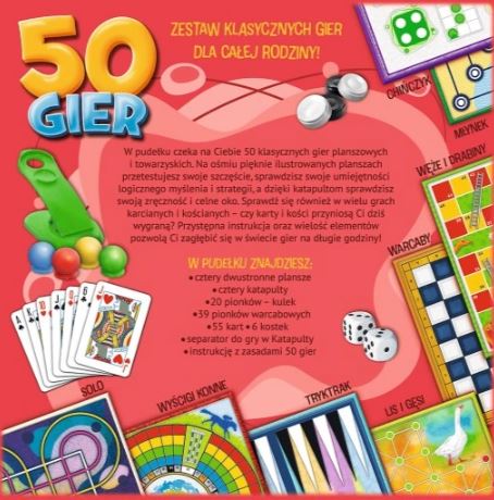 Zestaw klasycznych gier dla całej rodziny! W pudełku czeka na Ciebie 50 klasycznych gier planszowych i towarzyskich. Na ośmiu pięknie ilustrowanych planszach przetestujesz swoje szczęście, sprawdzisz swoje umiejętności logicznego myślenia i strategii, a dzięki katapultom sprawdzisz swoją zręczność i celne oko. Sprawdź się również w wielu grach karcianych i kościanych – czy karty i kości przyniosą Ci dziś wygraną? Przystępna instrukcja oraz wielość elementów pozwolą Ci zagłębić się w świecie gier na długie godziny!