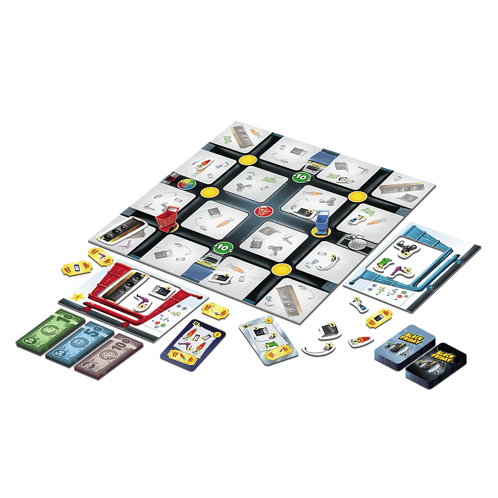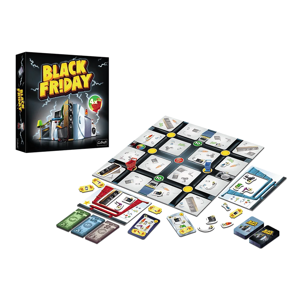 Wyruszcie na szalone zakupy! W grze Black Friday Waszym zadaniem będzie realizowanie list zakupów, aby zdobyć jak największą ilość punktów. Wypłacajcie pieniądze z bankomatu, poruszajcie się pionkami — koszykami po planszy sklepu i umieszczajcie przedmioty w koszyku. Pamiętajcie jednak, że macie ograniczone miejsce. Kto zdobędzie najwięcej punktów, wygrywa!