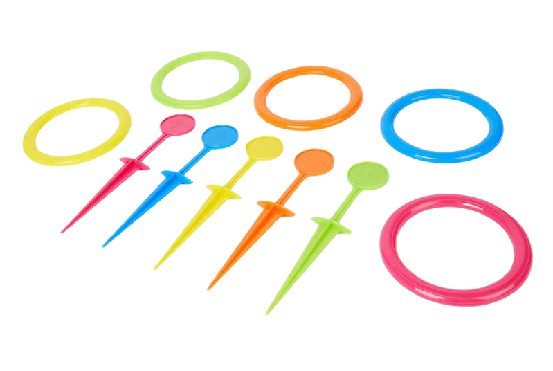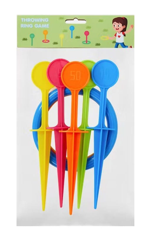 Zagraj z dziećmi w ogrodzie w zabawną grę z rzucaniem pierścieni. Zestaw składa się z 5 pierścieni i 5 słupków. Każdy słupek jest oznaczony punktami, które się zyskuje za trafienie. Kto zdobędzie najwięcej punktów?