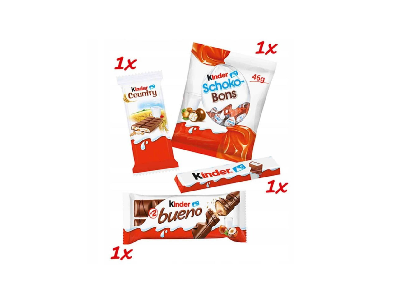 • Kinder Country – mleczna czekolada wypełniona delikatnym nadzieniem mlecznym i chrupiącymi zbożami. Idealne połączenie słodyczy i przyjemnej, chrupiącej tekstury.