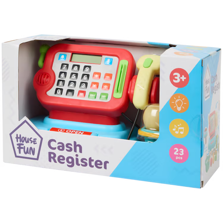 Zapraszam do kasy! Zeskanuj wszystkie produkty przy użyciu tej kasy. Światło i dźwięk sprawiają, że wydaje się prawdziwa. Pamiętasz, jak włożyć pieniądze do szuflady?