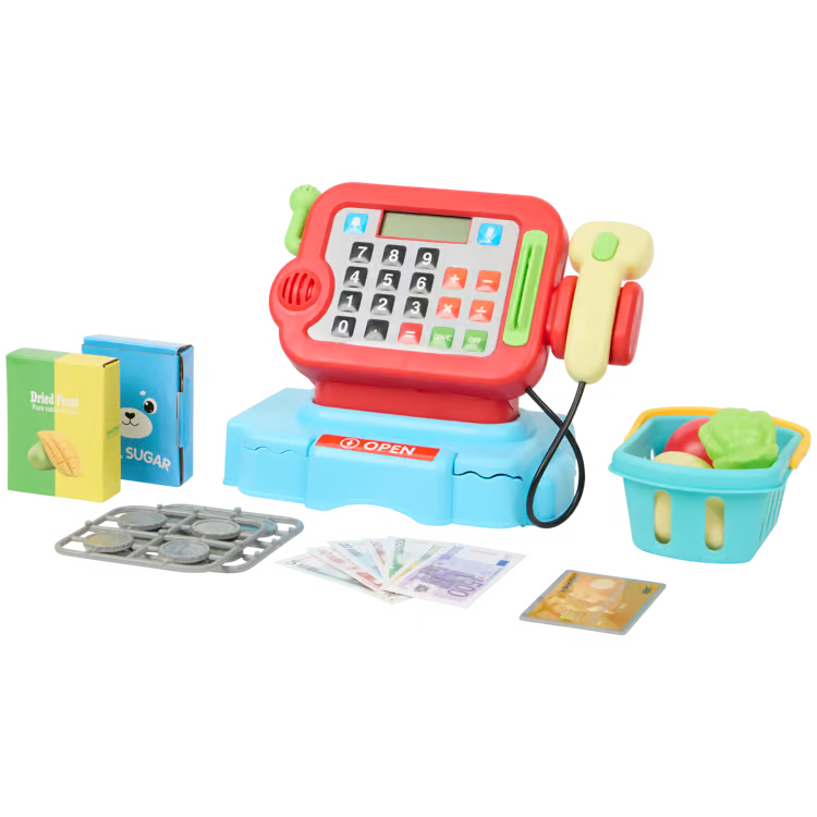 Posiada ona wiele funkcji min. mikrofon, świecący i piszczący skaner i przyciski. Kasa posiada i pieniądze (monety i banknoty).