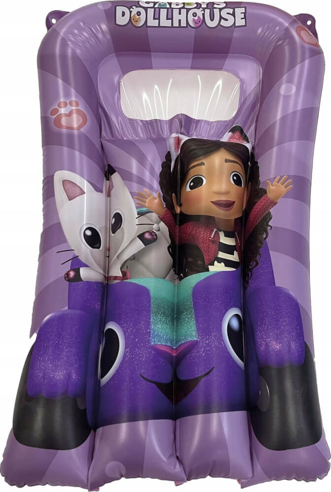 Dmuchany materac z uwielbianą bohaterką bajki dla dzieci - Koci domek Gabi, sprawi radość podczas wodnych zabaw! Wymiary materaca po nadmuchaniu to ok. 67 cm długości i ok. 43 cm szerokości. Materac posiada zgłębienie na głowę, jest fioletowego koloru, a w centralnej części materaca znajduje się grafika Gabi, jadącej w samochodzie z Pandusiem.