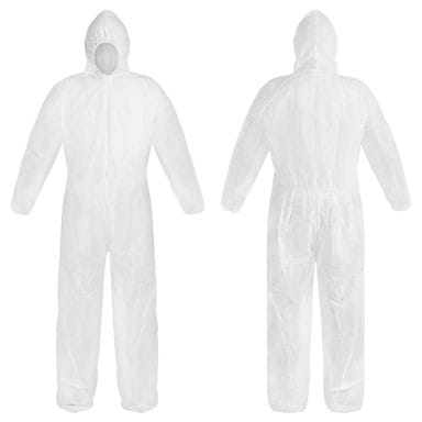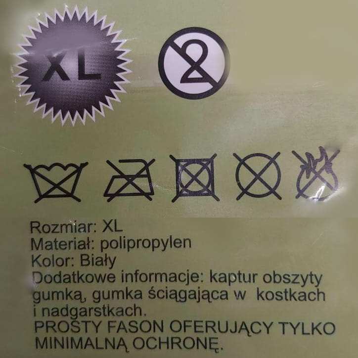 Kombinezon zamykany na zamek błyskawiczny. Wykonany z polipropylenu o gramaturze 40 g/m2. Rozmiar XL. Kaptur obszyty gumką ściągającą, w kostkach i nadgarstkach.