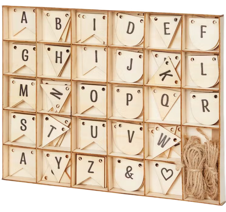 Zrób nazwę lub cytat z łańcucha z drewnianymi flagami. Również nadaje się do dekoracji np. kartki lub prezentu.