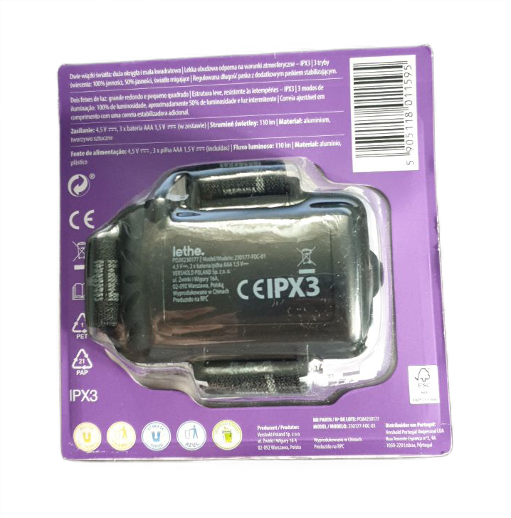 Latarka czołowa marki Lethe posiada oświetlenie LED z regulacją wiązki światła. Jest dużym udogodnieniem dla osób, które cenią sobie swobodę i możliwość posiadania wolnych rąk. Mocowana jest bezpośrednio na czole lub kasku za pomocą specjalnych regulowanych pasków. Latarka zasilana jest bateriami typu AAA. posiada bardzo lekką obudowę, odporną na warunki atmosferyczne. Posiada 3 tryby świecenia: 100% jasności, 50% jasności, światło migające.