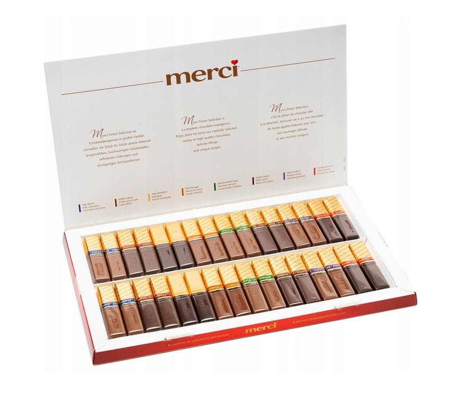Czekoladowa kolekcja Merci idealnie sprawdza się jako deser podany do kawy lub na spotkania z przyjaciółmi. Pięknie zapakowane w ozdobne pudełko czekoladki sprawdzą się jako prezent dla drugiej osoby. To również doskonały podarunek wyrażający wdzięczność i uczucie.