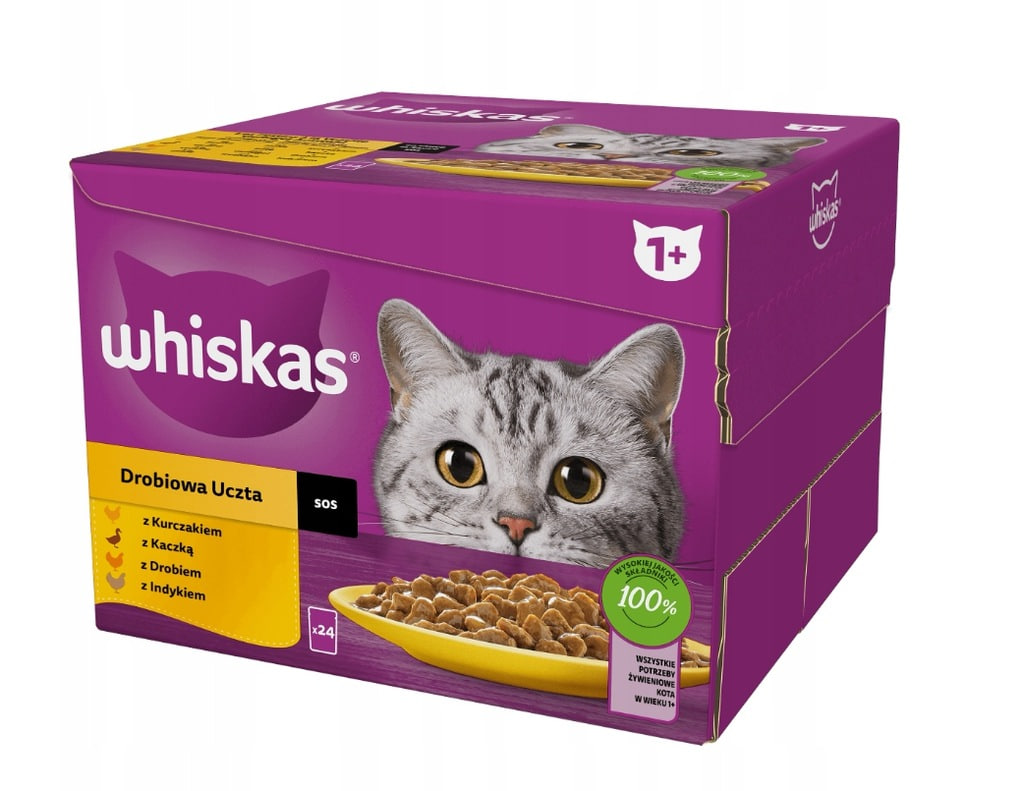 Zbilansowana karma mokra dla kota, której się nie oprze! Whiskas wie, co kocha Twój kot i czego naturalnie potrzebuje. Whiskas Smaki Rybne i Tradycyjne w Galaretce to zestaw starannie przygotowanych, kompletnych i zbilansowanych mokrych karm dla dorosłych kotów (powyżej 1. roku życia). Zestaw zawiera saszetki w 4 różnych smakach: z kurczakiem, z łososiem, z wołowiną i z tuńczykiem. Każde danie Whiskas w galaretce to pokarm pełnoporcjowy, więc zaspokoi wszystkie potrzeby żywieniowe Twojego kota, dostarczając mu potrzebną energię i niezbędne składniki odżywcze. Mokra karma Whiskas zawiera odpowiedni poziom minerałów, by wspierać zdrowie dróg moczowych, oraz cynk, który pomaga zachować zdrową skórę i sierść. Danie w saszetce Whiskas to pożywne, pozbawione sztucznych dodatków smakowych, barwników i konserwantów kąski, które Twój kot instynktownie pokocha.