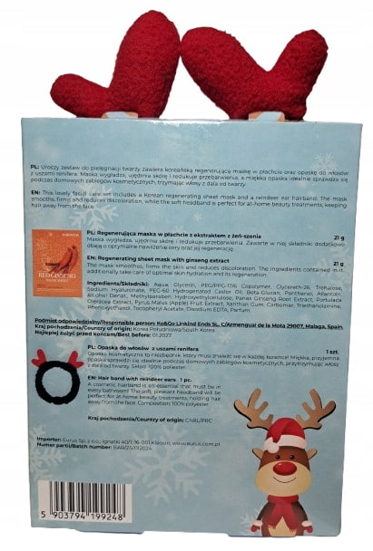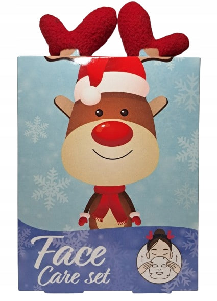 Uroczy zestaw do pielęgnacji twarzy zawiera regenerującą maskę na płachcie oraz opaskę do włosów z uszami renifera.