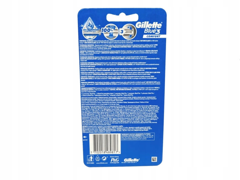 Jednorazowa maszynka, która zapewnia komfortowe golenie nawet do 10 razy? To możliwe dzięki maszynce Gillette Blue3 Comfort z 3 chromowanymi ostrzami podążającymi za konturem twarzy i ruchomej główce, która dopasowuje się do kształtów twarzy. Ulepszony pasek nawilżający Lubrastrip z aktywowaną wodą technologią Comfortgel zapewnia najwyższy komfort. Maszynkę wyposażono w antypoślizgową gumową rączkę zapewniającą lepszą kontrolę, a także łatwe w czyszczeniu ostrza zapewniające w 100% lepsze czyszczenie (w porównaniu z Blue II Plus).