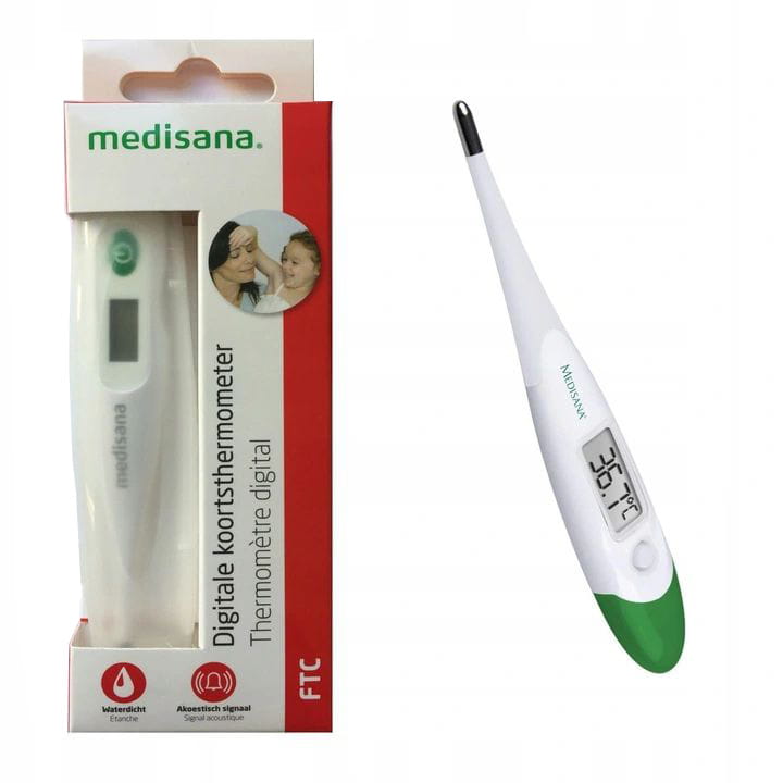 Termometr cyfrowy FTC Medisana to precyzyjne, wodoodporne urządzenie do pomiaru temperatury ciała. Termometr posiada akustyczny alarm sygnalizujący gorączkę oraz sygnalizację gotowości do pomiaru i zakończenia pomiaru. Urządzenie ma ekran LCD z cyfrowym wyświetlaczem. W zestawie pudełko do przechowywania.