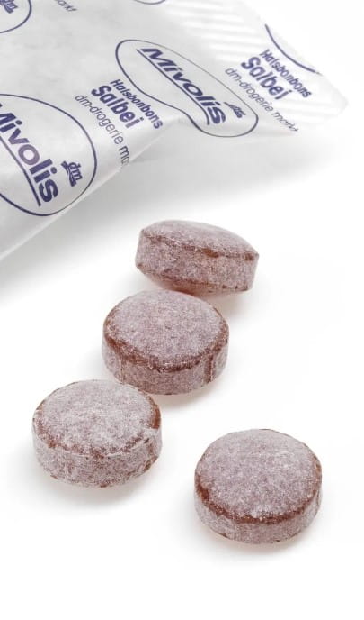 Olejek eteryczny nadaje cukierkom z szałwii szczególnie aromatyczny smak. Idealne również w czasie podróży. Pastylki na gardło z szałwią Mivoli są bogate w witaminę C. W 100 g znajduje się 800 mg witaminy C. Już 4 cukierki pokrywają dzienne zapotrzebowanie na witaminę C.