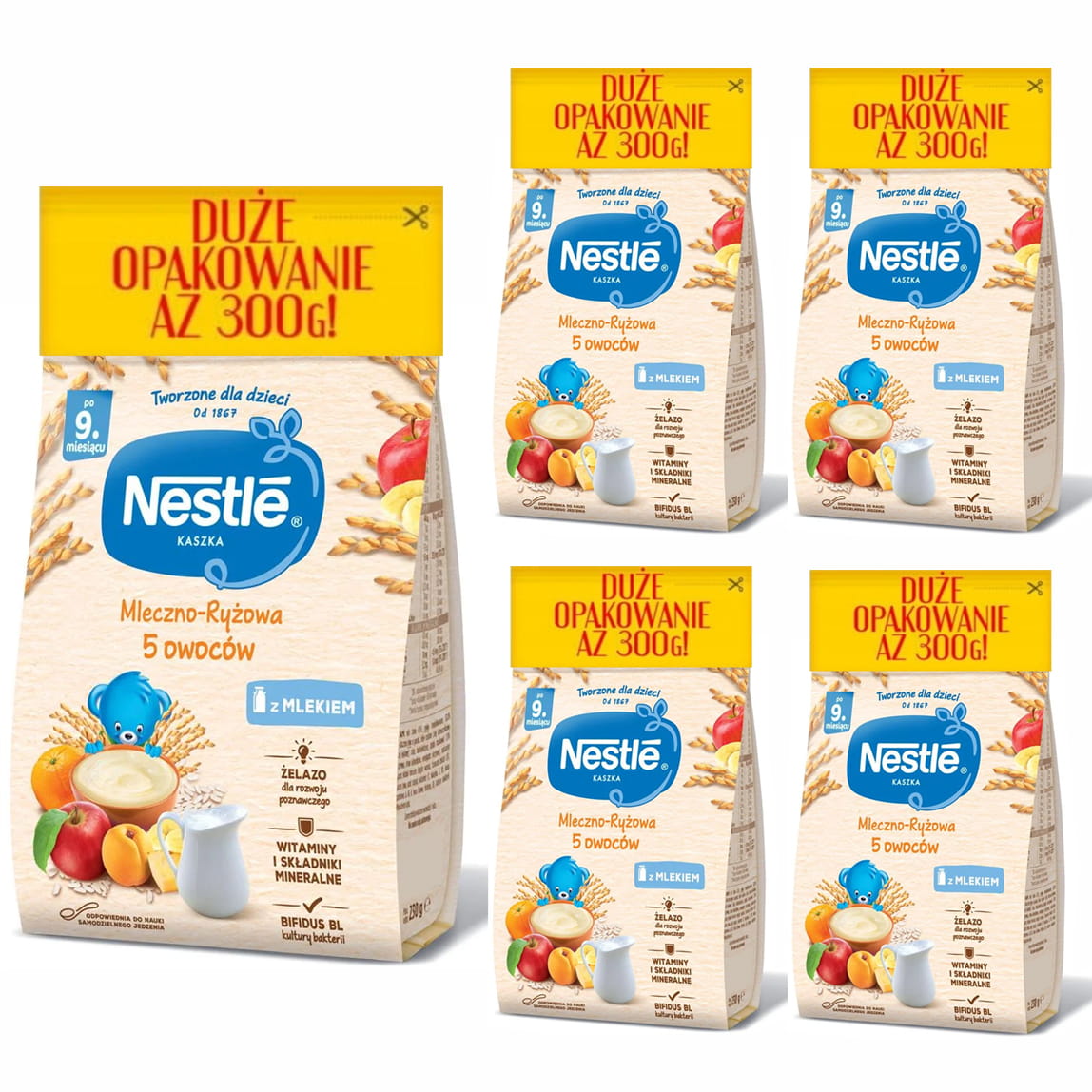 NESTLE Kaszka mleczno-ryżowa 5 owoców - po 9 miesiącu 5x300g