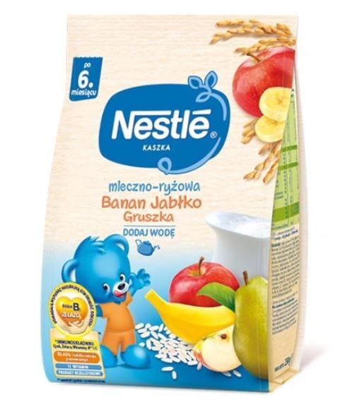 Kaszka mleczno-ryżowa Nestlé to pyszny pokarm o smaku jabłka, banana i gruszki . Jest to środek spożywczy specjalnego przeznaczenia żywieniowego. Kaszka to doskonały sposób na urozmaicenie diety malucha po 6 miesiącu życia. Kaszka wyprodukowana jest z wysokiej jakości ryżu pochodzącego z kontrolowanych upraw. Kaszka mleczno-ryżowa o smaku jabłka, banana i gruszki to pełnowartościowy, bezglutenowy posiłek. Dzięki zawartości mleka modyfikowanego, wystarczy dodać wodę, aby posiłek był gotowy.