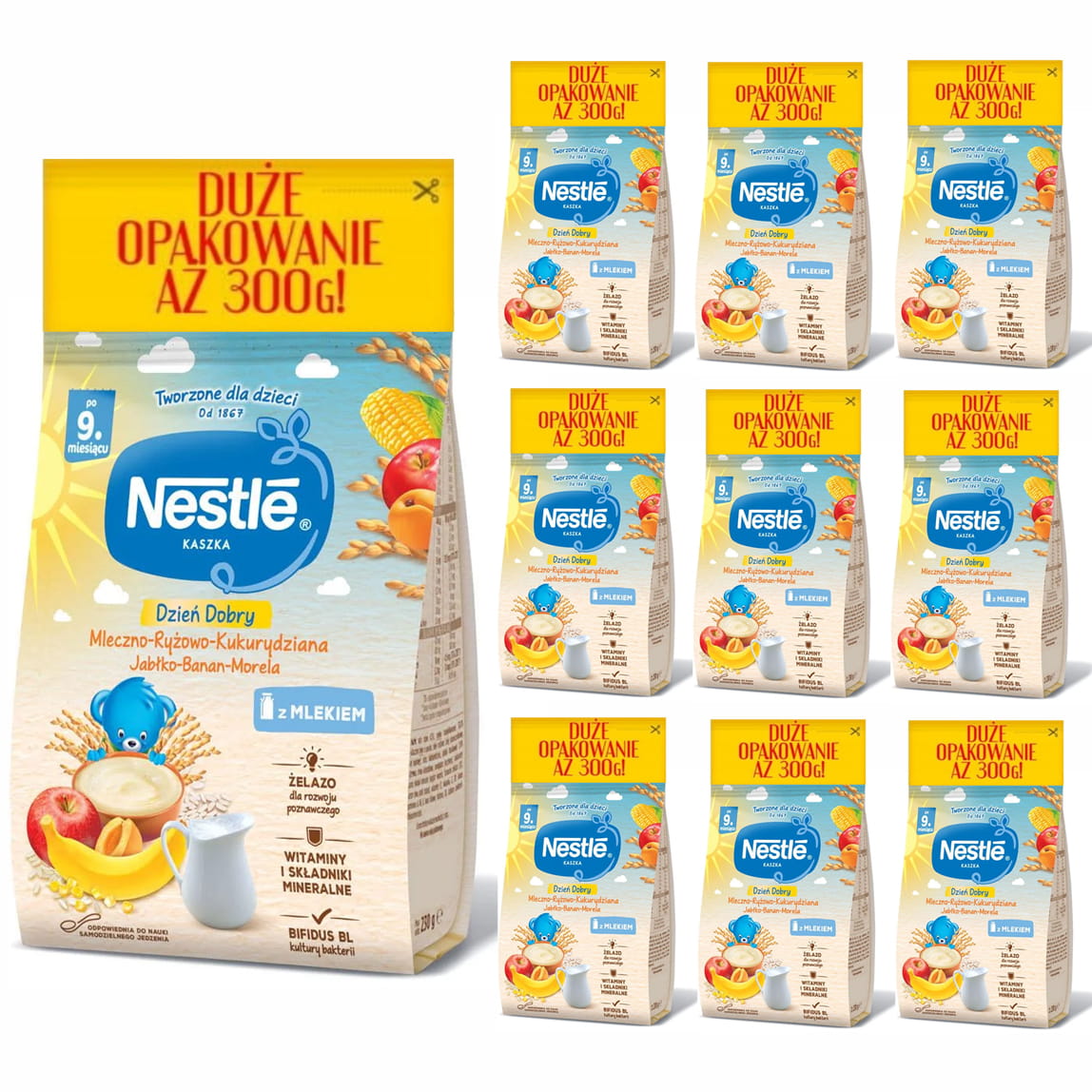 NESTLE Kaszka mleczno-ryżowa Jabłko Banan Morela po 9 miesiącu 10x300g