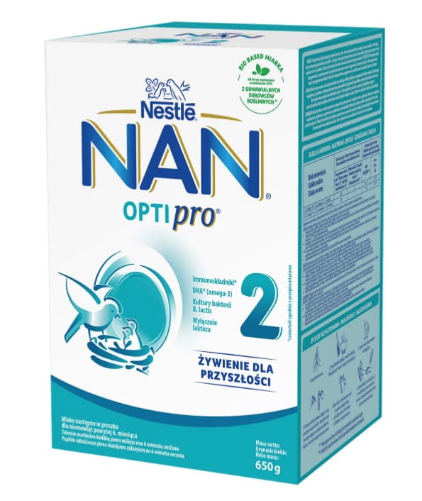 NAN OPTIpro® 2 to preparat do dalszego żywienia niemowląt, który dostarcza Twojemu maluszkowi składników pokarmowych potrzebnych do prawidłowego rozwoju. Zawiera m.in.: