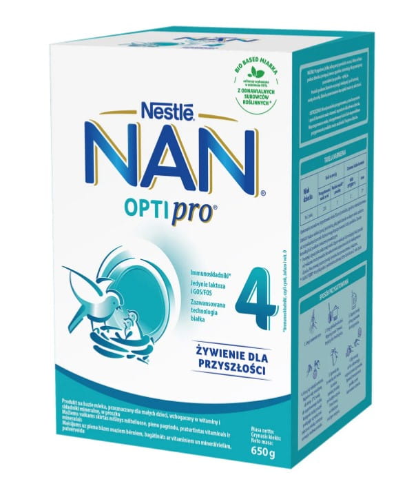 NAN OPTIpro® 4 to mleko modyfikowane w proszku opracowane z myślą o potrzebach dzieci po 2 roku życia, które są zupełnie inne niż dorosłych (zapotrzebowanie na składniki odżywcze). Jadłospis Juniora powinien uwzględniać wyjątkowe potrzeby małego organizmu.