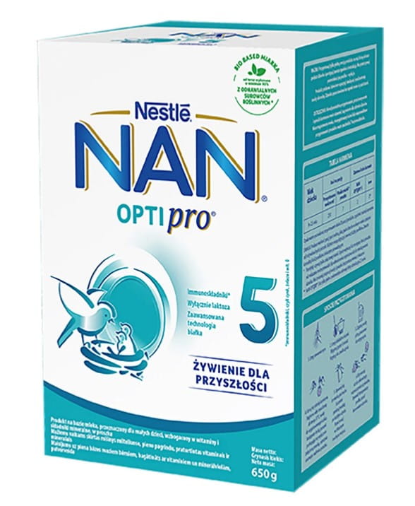 Nestle NAN OPTIpro® 5 to mleko modyfikowane w proszku wzbogacone w składniki mineralne oraz witaminy, które zostało opracowane specjalnie z myślą o dzieciach powyżej 2,5 roku życia. Skład mleka oparty jest na mleku krowim, jednak został zmieniony tak, by lepiej zaspokajać potrzeby żywieniowe młodego człowieka. Zawiera mniejszą ilość białka niż mleko krowie oraz ma wyższą zawartość: witaminy C i D, żelaza oraz kwasów tłuszczowych (mleko krowie nie zawiera odpowiednio wysokiego poziomu tych składników).