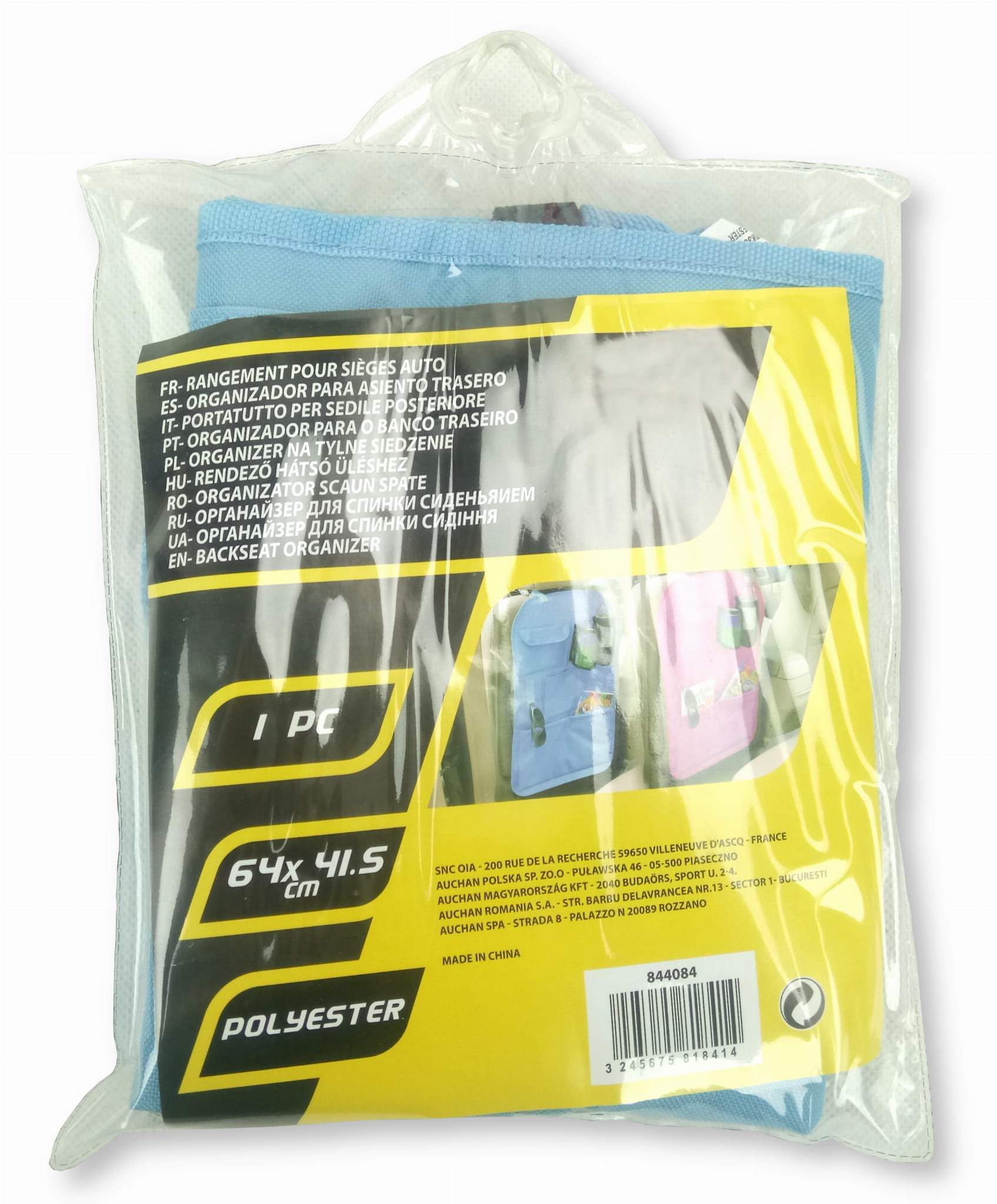 Organizer na fotel samochodowy, ochraniacz. Uniwersalny i pojemny organizer samochodowy idealnie sprawdzi się w każdym samochodzie. Przydatny podczas podróży, to właśnie w nim możesz przechować ulubione zabawki, akcesoria lub napoje Twojego dziecka. Dodatkowo pełni funkcję ochraniacza przed zabrudzeniami. Organizer posiada kieszeń zapinaną na rzep, 2 siatkowe kieszenie, 3 duże kieszenie poliestrowe oraz klamrę na którą można zaczepić np. okulary.