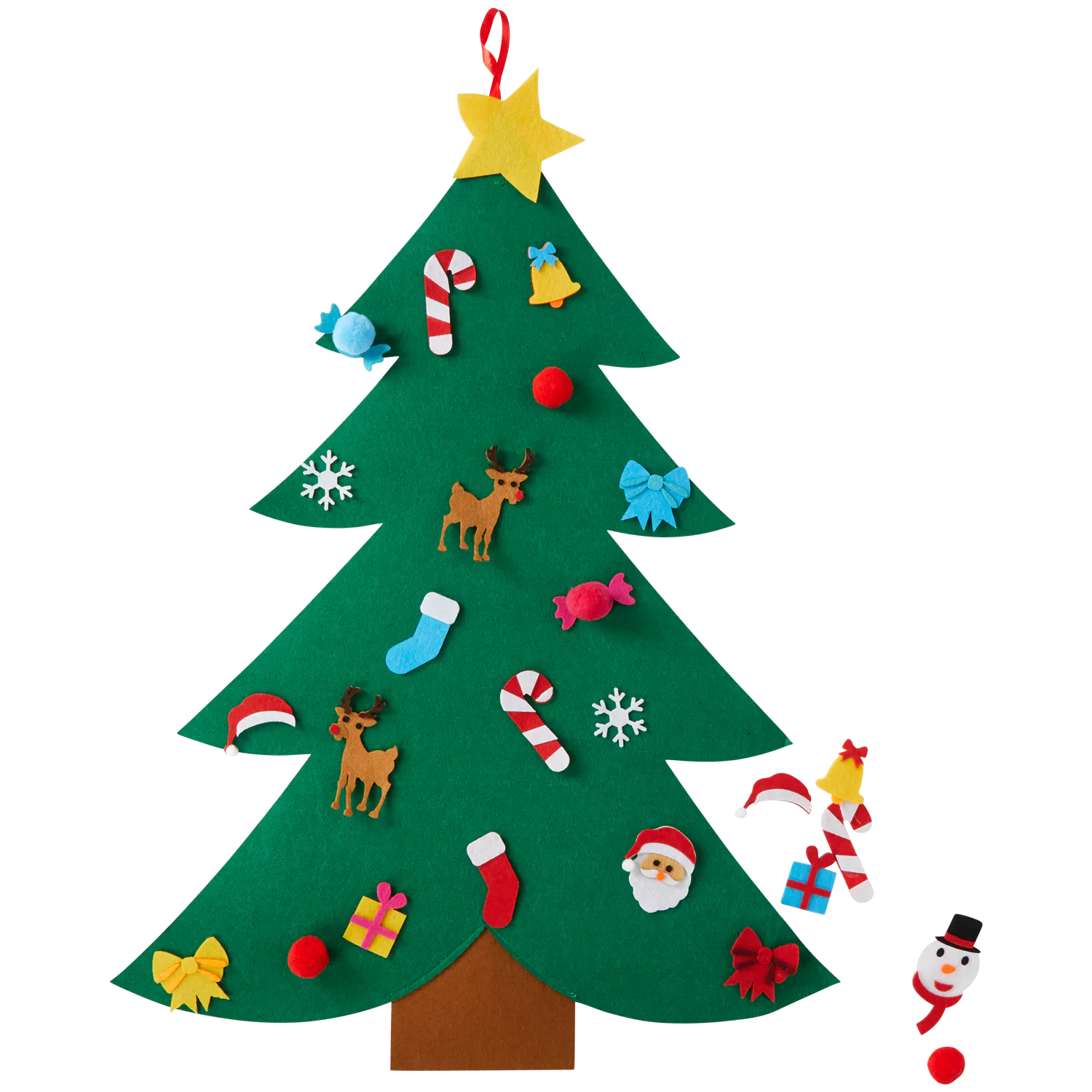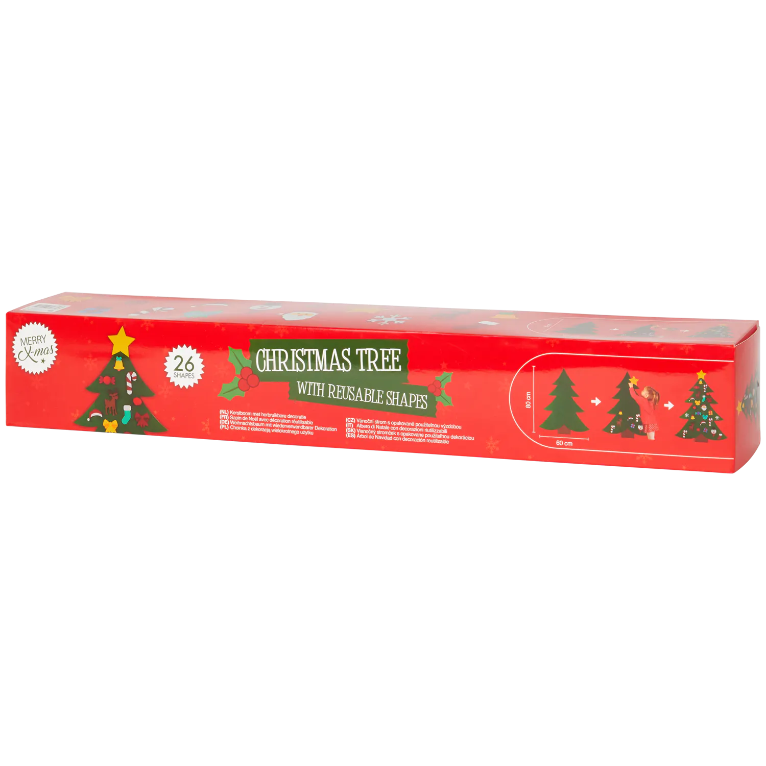 Choinkę z filcu, przyjazną dla dzieci. Wys. ok. 80 cm, szer. w najszerszym miejscu ok. 60 cm. W zestawie znajduje się 26 ozdób z filcu wielokrotnego użytku, do przyczepienia na choince. Choinkę, po udekorowaniu, można zawiesić na ścianę, drzwi, itp. Czy twój maluch marzy, by pomóc w ubieraniu choinki? Ta choinka sprawi, że będzie mógł stworzyć własne dzieło!