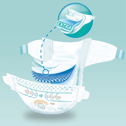 - 3 kanaliki chłonne pomagające równomiernie rozprowadzić wilgoć w pieluszce