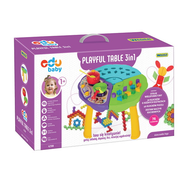 Blat stolika został podzielony na trzy części, a każda z nich zachęca dziecko do innej aktywności. Jedna z części to kuchenka, na której można bawić się w gotowanie, kolejna pełni funkcję zabawki-sortera, do której dziecko dopasowuje klocki o geometrycznych kształtach, trzecia część to biurko do rysowania, układania, liczenia. Do zabawki dołączono zestaw naczyń, klocki puzzle oraz klocki do sortera.