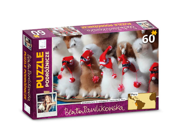 Puzzle firmy Edipresse Książki - autorska kolekcja cenionej podróżniczki Beaty Pawlikowskiej. Puzzle pozwolą Ci zobaczyć świat Jej oczami. Ułóż 60 elementową układankę i odkryj zdjęcie "Andyjskie lamy w wełnianych czapeczkach" wykonane w Peru.