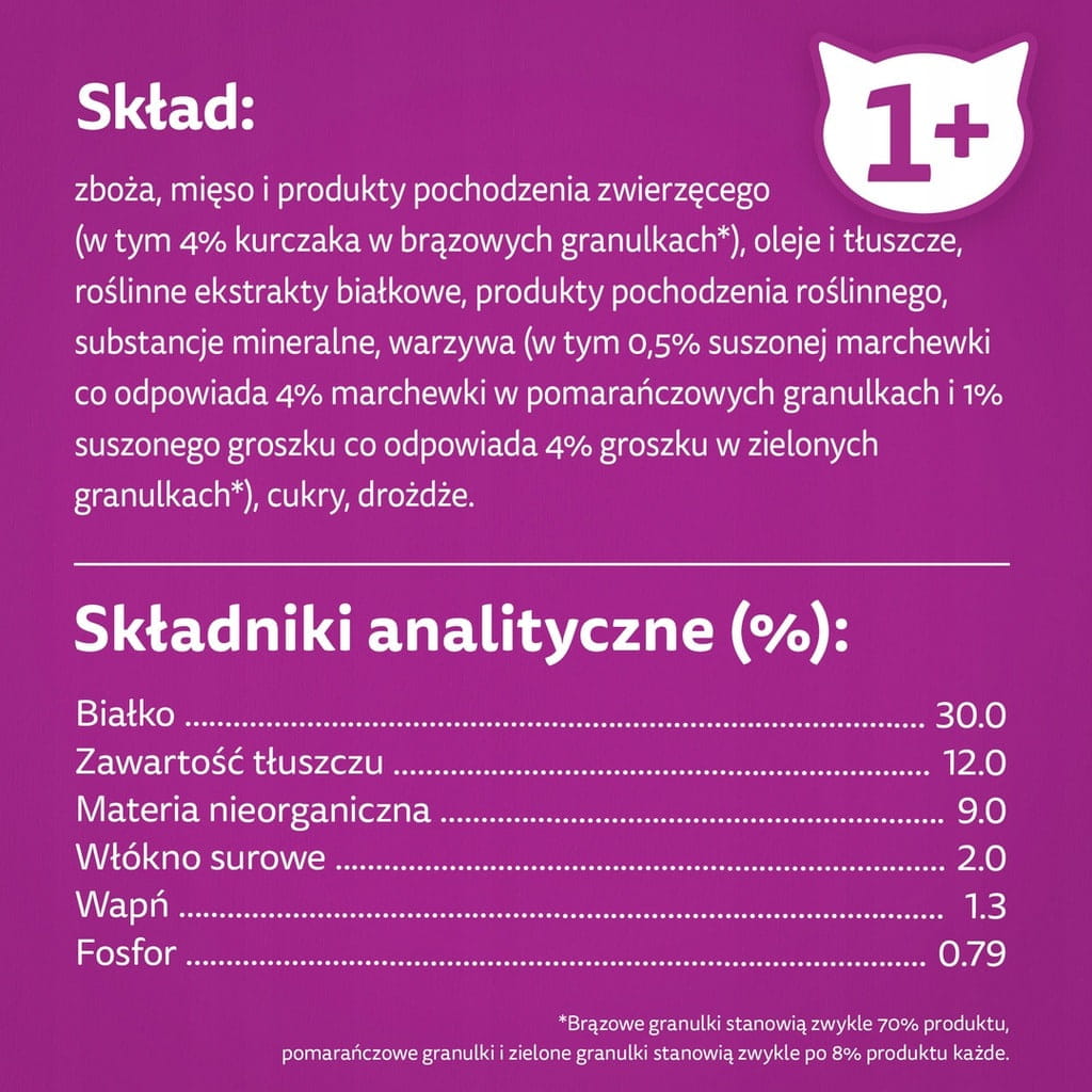 Skład: zboża, mięso i produkty pochodzenia zwierzęcego (w tym 4% kurczaka w brązowych granulkach*), oleje i tłuszcze, roślinne ekstrakty białkowe, produkty pochodzenia roślinnego, substancje mineralne, warzywa (w tym 0,5% suszonej marchewki co odpowiada 4% marchewki w pomarańczowych granulkach i 1% suszonego groszku co odpowiada 4% groszku w zielonych granulkach*), cukry, drożdże.